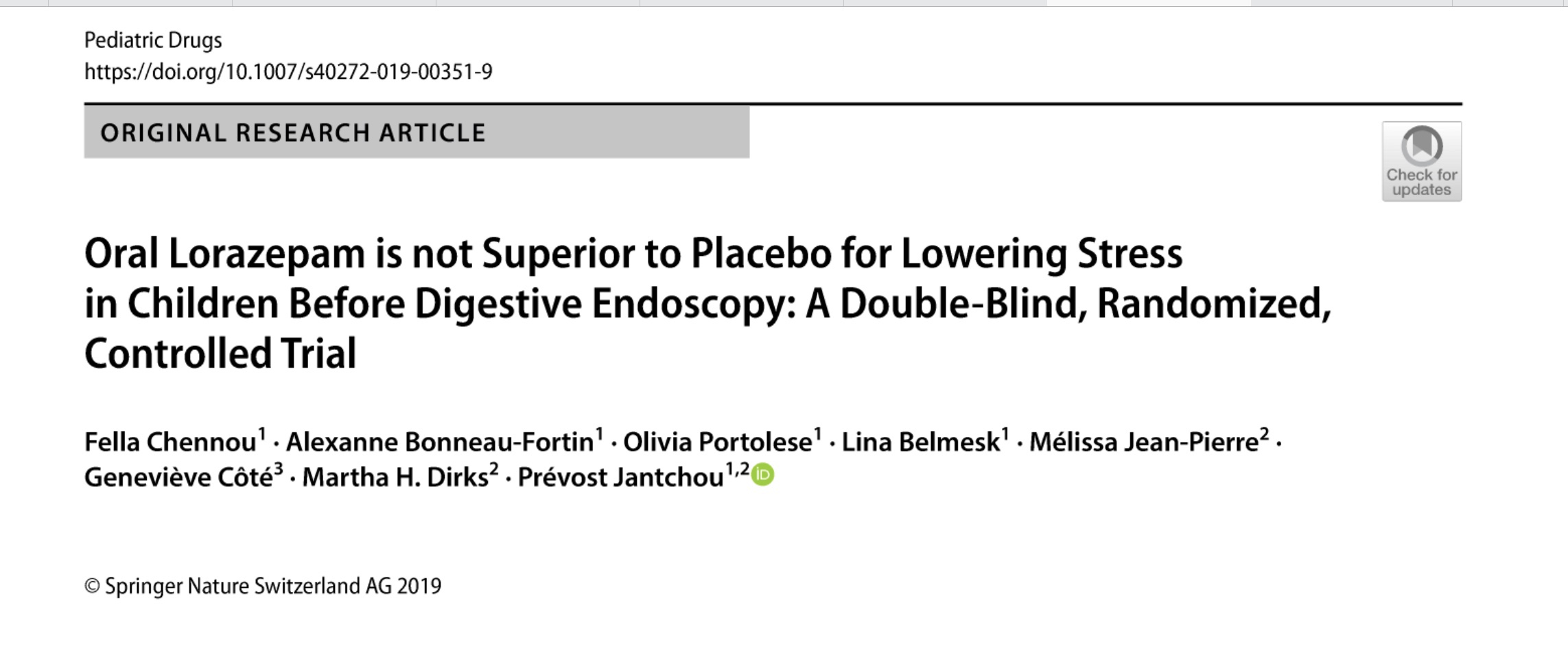 Notre article portant sur l’effet du Lorazepam (une benzodiazepine) en prémédication orale avant endoscopie digestive a été publié dans la revue Pediatric Drugs.